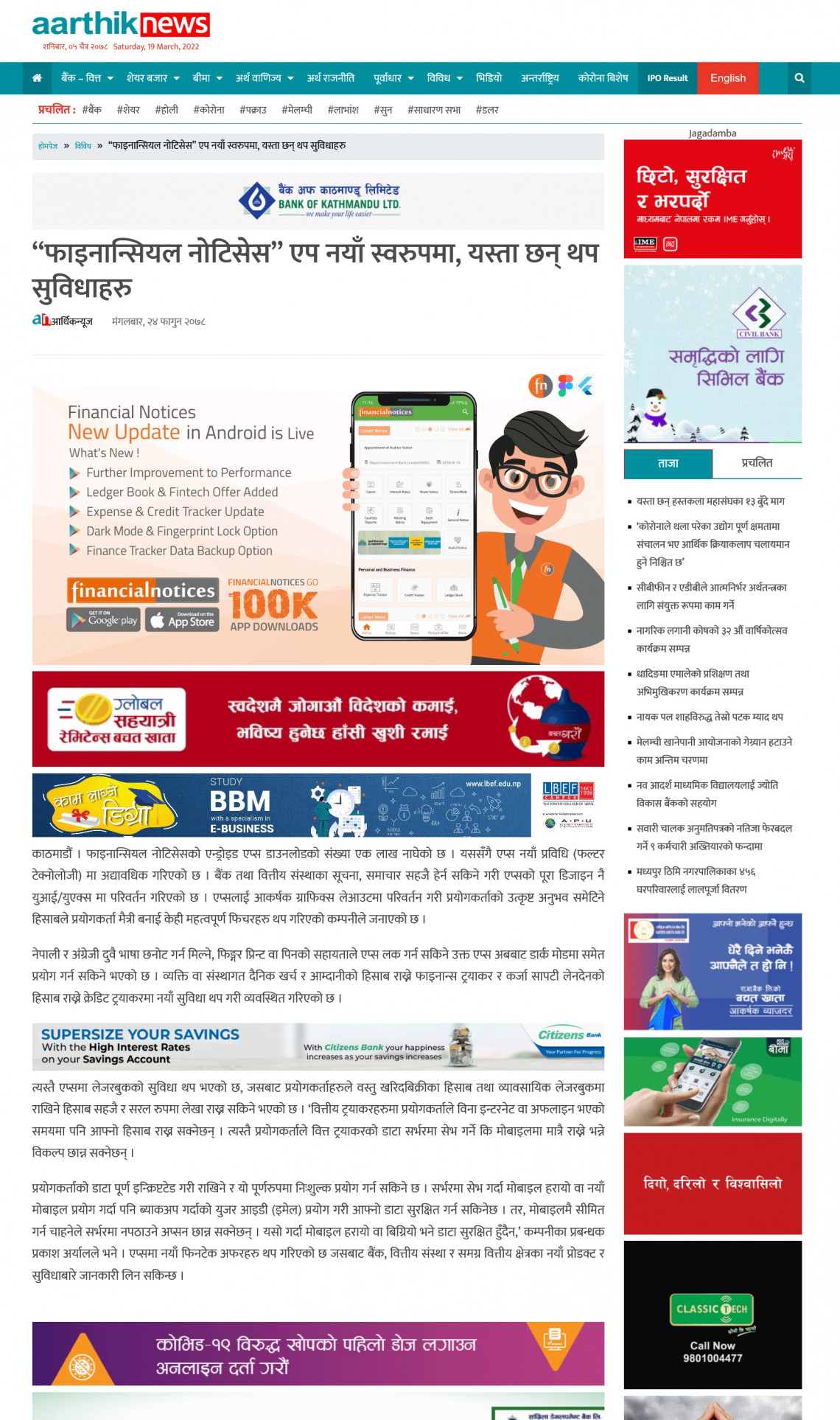 “फाइनान्सियल नोटिसेस” एप नयाँ स्वरुपमा, यस्ता छन् थप सुविधाहरु (Aarthik News)